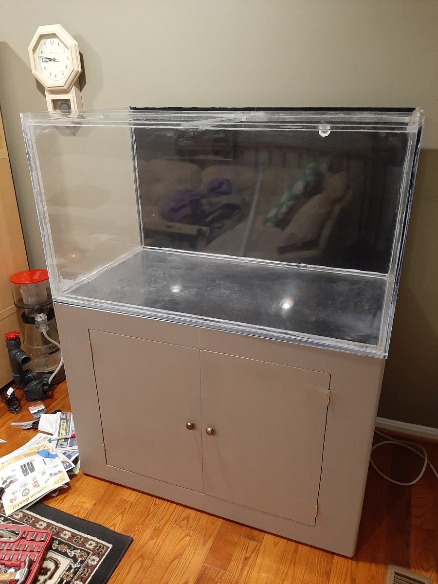 Aquastudent January 10, 2021 January 10, 2021 (edited) It's about time I jumped into this hobby for real. I started with a Fluval Evo13.5 which I converted into a 20T. I've mostly been barely growing the few corals I have. I recently combined my two large freshwater tanks into a new 150G. That freed up a 100G acrylic tank that I think would look great as a reef. The dimensions are 44"×24"x24". I have been slowly accumulating the supplies to make the jump up. Major items procured: Tank and Stand Eclipse L Overflow Titanium Heater and Controller 29G with FijiCube DIY sump baffles Bullhead for return from sump Dry rock (foundation and bulk), super glue, mortar - I'm going to do a negative space aquascape Major Items still to procure : Lighting - Kessil AP9X Skimmer Return Pump RO/DI System ATO Current top priority on this list is the skimmer. My current tasks are buffing out the minor scratches in the acrylic display tank, drilling the holes for the bulkheads, and painting the background black. I plan on placing the overflow on there left 1/3 on the back wall and then putting the 1" bulkhead for there return in the upper right. Current plan is to step down the 1" return to 3/4" and use locline. I installed a 40B sump with the FijiCube baffles on the freshwater 150G and absolutely love it. First major challenge is the sump. I went with the largest standard size aquarium I could fit in the stand. Unfortunately, I may have gone too large as I don't have much room to work above the sump. Since i don't have a skimmer yet I can't test whether I could remove it for maintenance. There is a width of a 2x4 with of space above the bottom of the opening for some minor maneuvering. Should I step down the sump to a 20L for the extra headroom? I think it'll be large enough, it's just nicer to have the extra 30% volume. Edited February 2, 2021 by Aquastudent