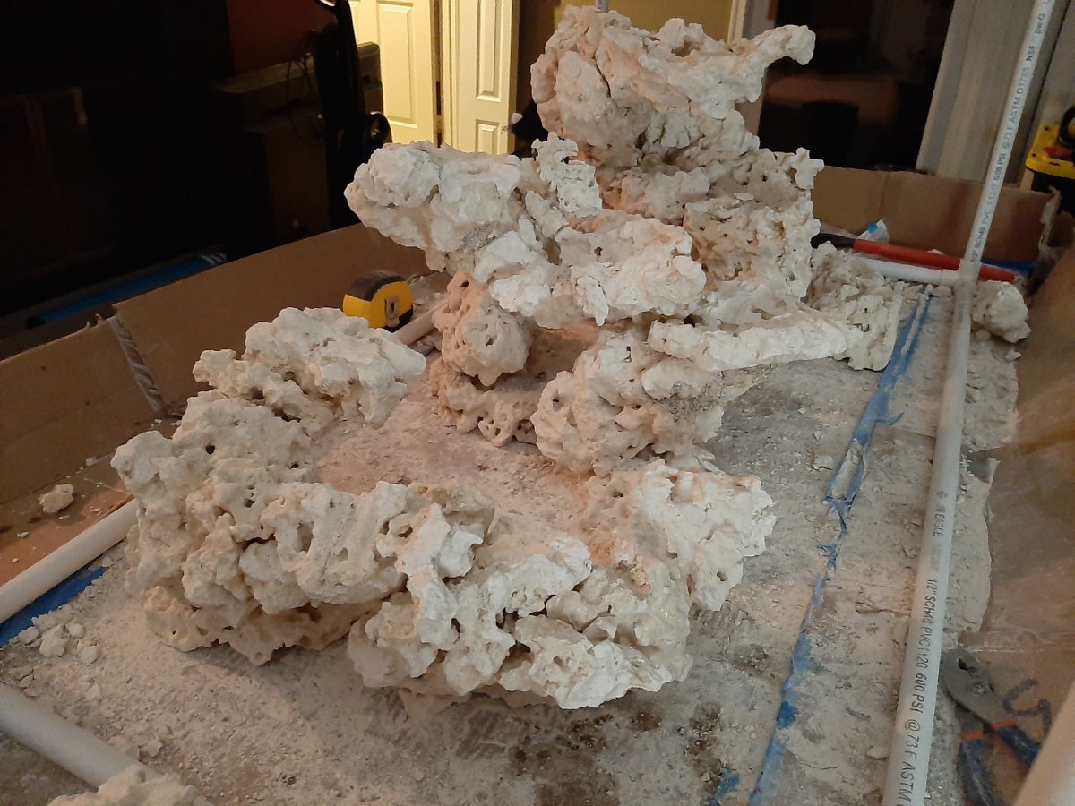 Aquastudent February 14, 2021 Author February 14, 2021 (edited) I've been making steady progress. Today's project was constructing the aquascape. I used MarcoRocks and broke them into smaller pieces. I used a combination of super glue, accelerator, and crushed MarcoRock to construct the core scape. The accelerator ended up being the faster and easier method but the ground MarcoRock looks better by hiding the seams already. Because all the rock is pale white, the dimension doesn't show up well in photos. One challenge is that we built crossbraces into the top of this tank, which limits the size of pre-constructed scapes I can put in there. I didn't want to build it in the tank (even though after things start growing on it, the scape probably wouldn't come out in one piece). I hope my measurements and construction were within the limits! Tomorrow, if I still like the scape, I'll be mortaring it to lock it in. All I'll need is the RO/DI unit to be delivered and we can get cycling! I wanted to put a decent amount of negative space underneath the main scape. Also, I wanted to have a moderate amount of real estate as I'd like to try a variety of corals and learn more broadly about the hobby. I think there will be a wide range of lighting and flow levels with this setup. It's kind of funny... the part that I'm almost most excited about is the base rock up front i want to do a Zoa garden with! I ended up going with a Kessil AP9X because I liked the sleek design, built in capabilities, and coverage. My alternative was two A360 generation Kessils (or the Ecotech 15s) but I opted to not go with the double lights. I haven't dialed in the light yet. Wanted to see it above the tank though. I have completed the plumbing (and leak tested it). We're nearly there! Edited February 14, 2021 by Aquastudent